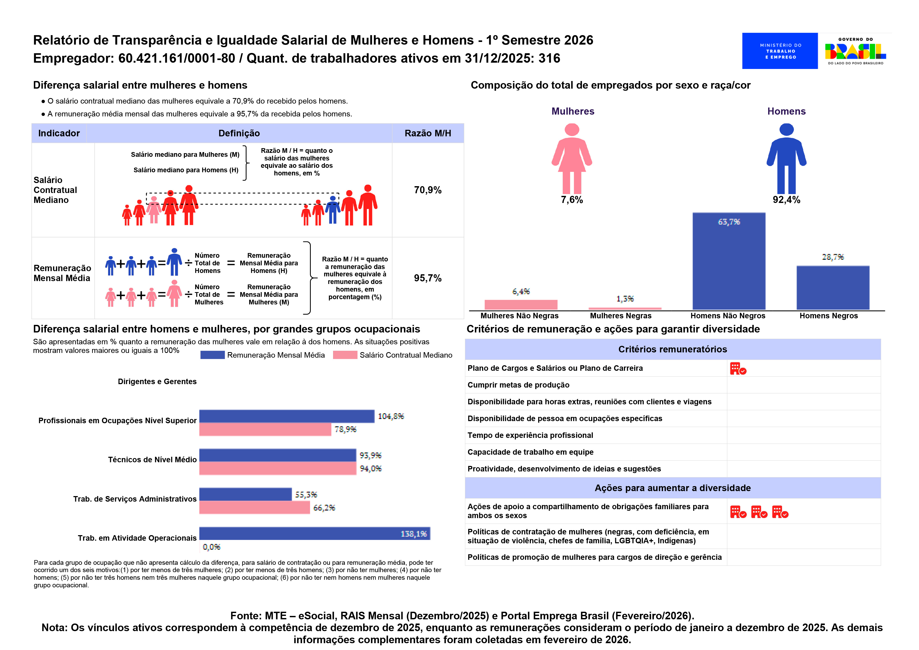 Importante destacar que o relatório se baseia em dados agregados e amplos, como os Grandes Grupos da Classificação Brasileira de Ocupações (CBO), bem como nas informações declaradas ao eSocial e à RAIS. Por essa razão, os dados nele constantes não necessariamente refletem a situação atual da empresa.